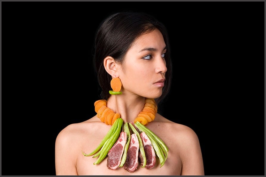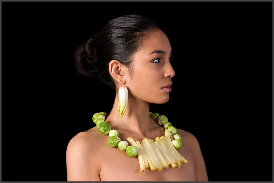 A model wears jewellery made from ingredients and food. Each photo represents a country. The ingredients and food used, come from the country in question or are popular there.