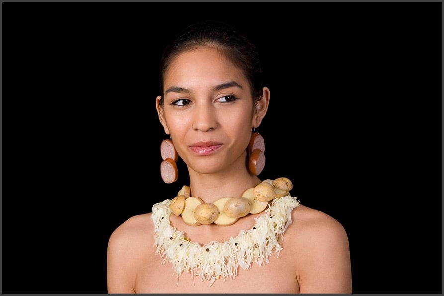 Germany | Earrings: sausages | Chocker: potatoes | Necklace: sauerkraut with peppercorn