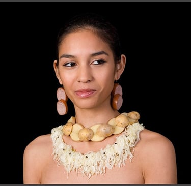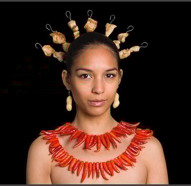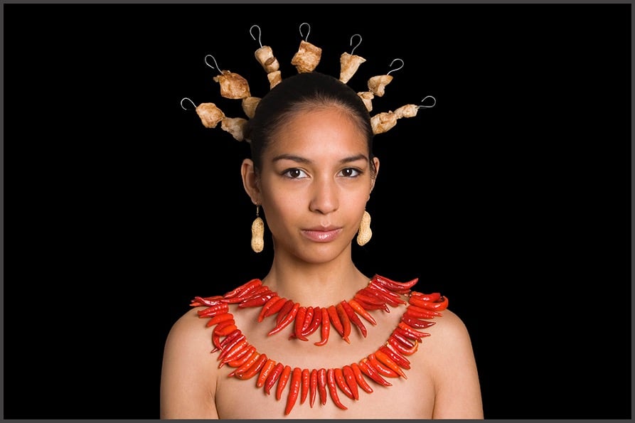 Indonesia | Head accessories: chicken filet | Earrings: peanuts | Necklaces: rawit (chili pepper)