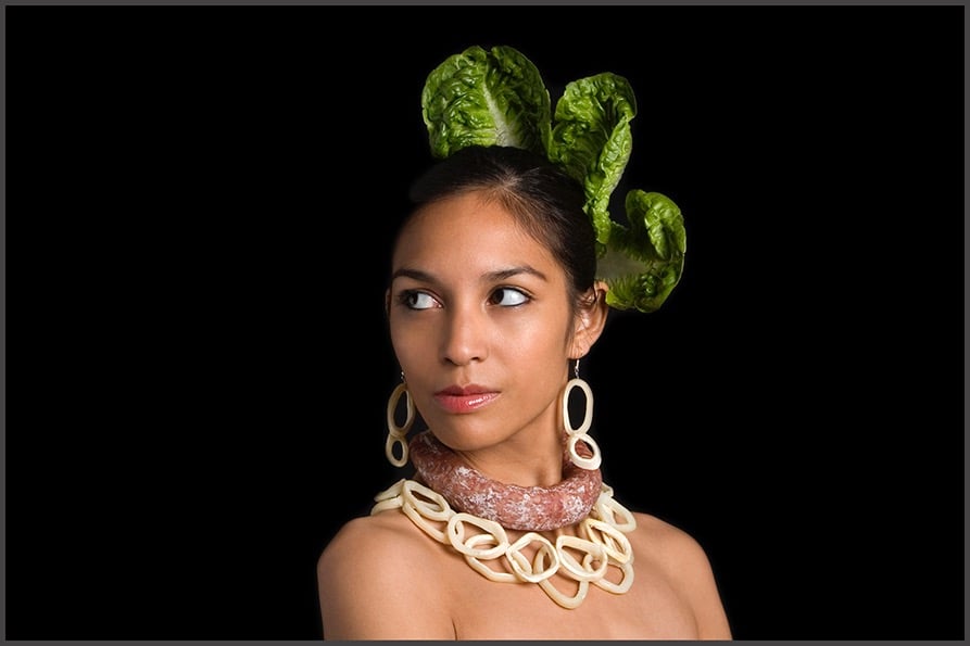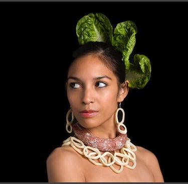 Spain | Head accessories: lettuce | Earring and necklace: calamari (squid) | Choker: chorizo