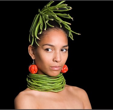 Suriname | Head gear and choker: long beans | Earrings: adjoema (hot) pepper