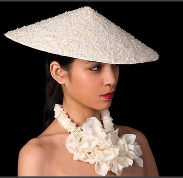 Vietnam | Head gear: nón lá (hat) with rice | Necklace: springroll pastry