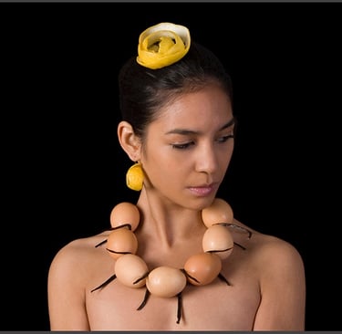 United States of America | Hair accessories and earring ring: lemon peel | Necklace: eggs and vanilla sticks