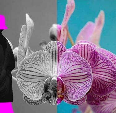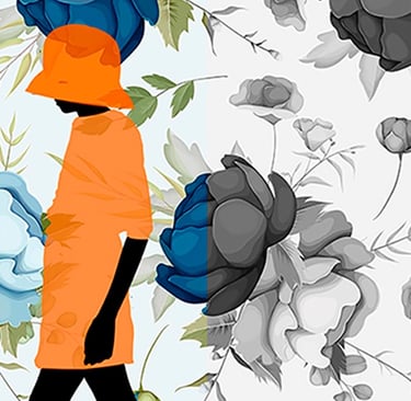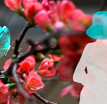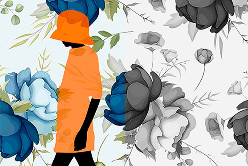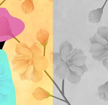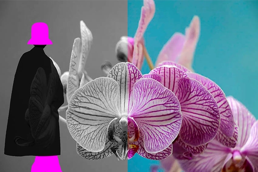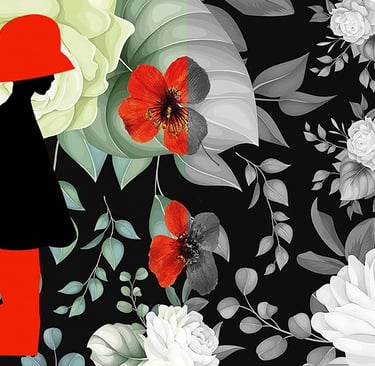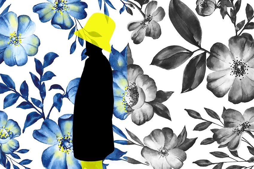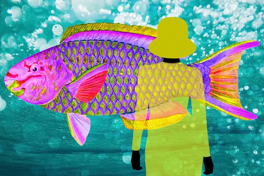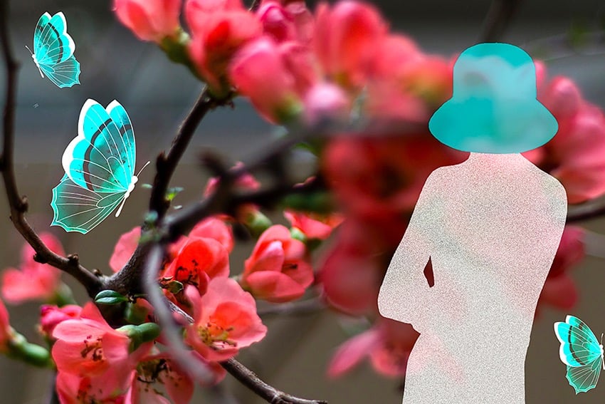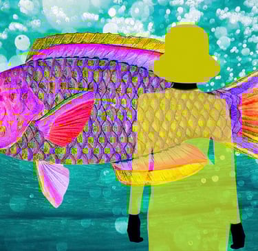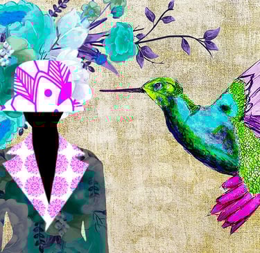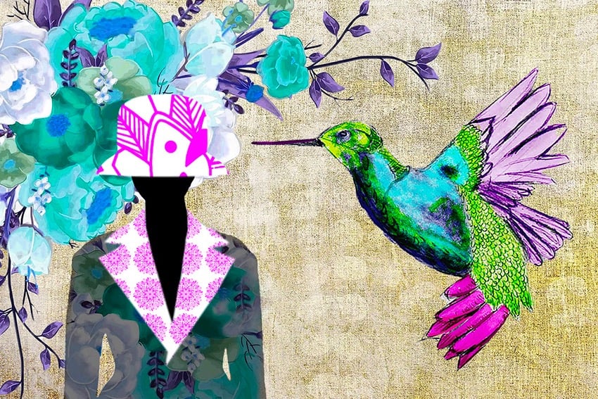 The figure with the hat, the fish, the hummingbird, the butterflies and some flowers were drawn by hand and some background flowers were photographed. The drawings and backgrounds were combined on the computer and digitally coloured.