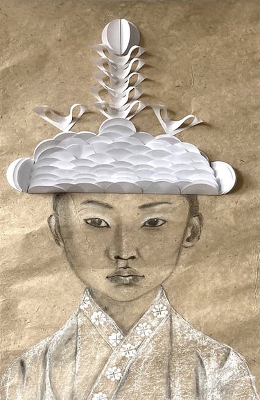 Banana paper, white mat paper, graphite pencil, white soft pastel and white acrylic