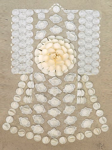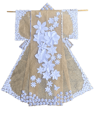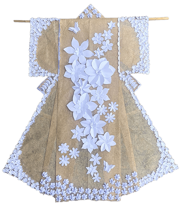 In Bali, you can find beautiful natural papers, such as banana paper. I saw it as a challenge to create a kimono using this material. I used origami techniques to form the back of the kimono. The kimono was decorated with paper flowers. The second kimono was made using Himalayan paper. The flowers on this kimono are a composition of a combination of paper and fabric.